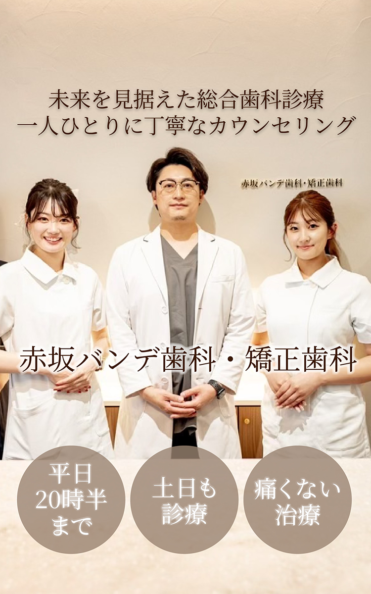 もちろん、高度な治療だけではなく「歯が痛い」「歯が取れてしまった」「クリーニングをしたい」などといったお悩みも丁寧かつしっかりとご対応させていただきますし、お急ぎの場合はご予約なしでも対応いたしますので、当日でもお気軽に是非赤坂の歯医者 赤坂バンデ歯科・矯正歯科にいらしてください。